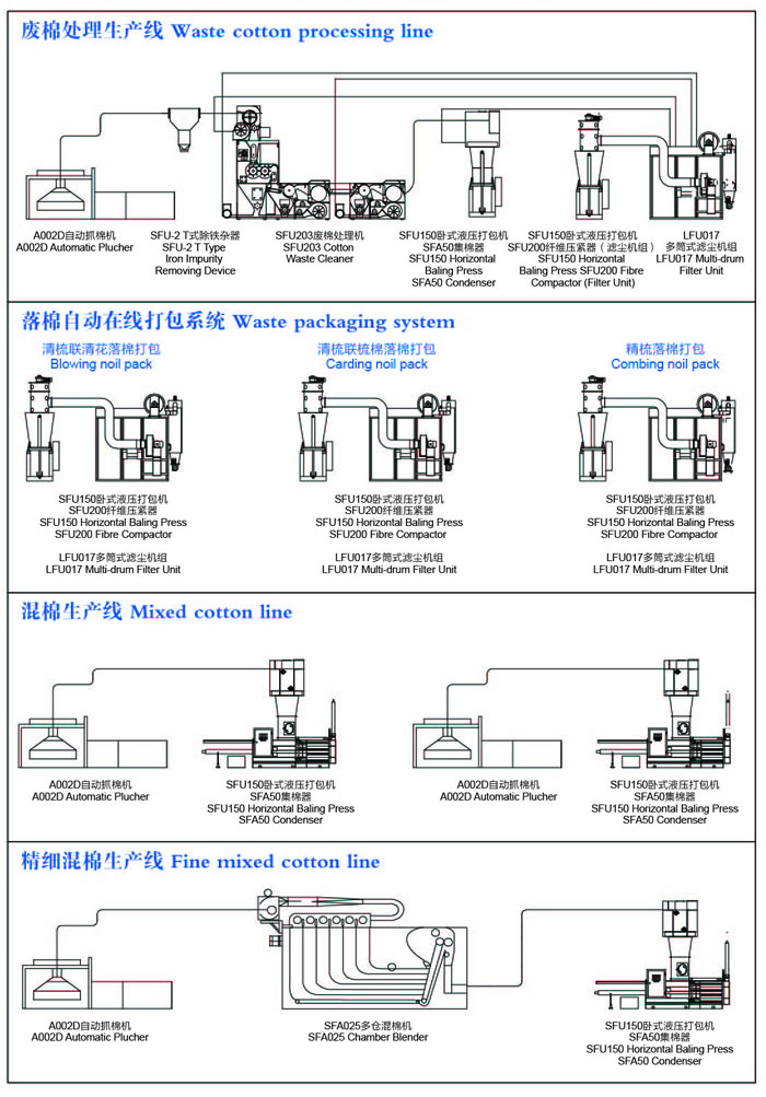 專業(yè)生產(chǎn)SFA系列開清棉設(shè)備(包括老機(jī)改造)、SFU廢棉處理機(jī)系統(tǒng)設(shè)備、紡織除塵設(shè)備、及粗紗頭開松機(jī)、立式臥式液壓打包
